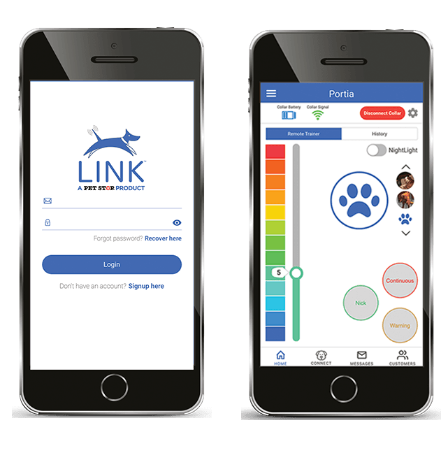 Pet Stop Link mobile app for Android & iOS — the industry’s first mobile app which allows Link collar owners to connect their collars via Bluetooth to use an extensive range of features